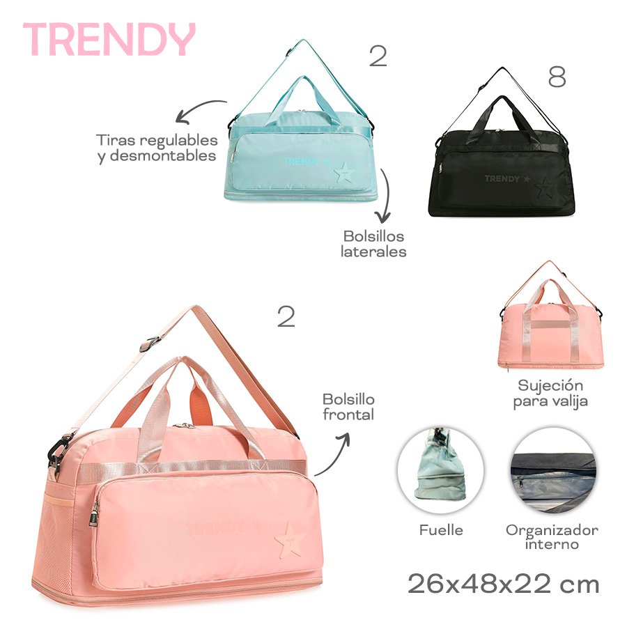 18574 – Bolso Trendy +INFO+FOTOS Info: Bol frontal, lats, org int, suj p valij, fuelle, tir desmnt Composición: Nylon Alto: 26cm Ancho: 48cm Profundidad: 22cm